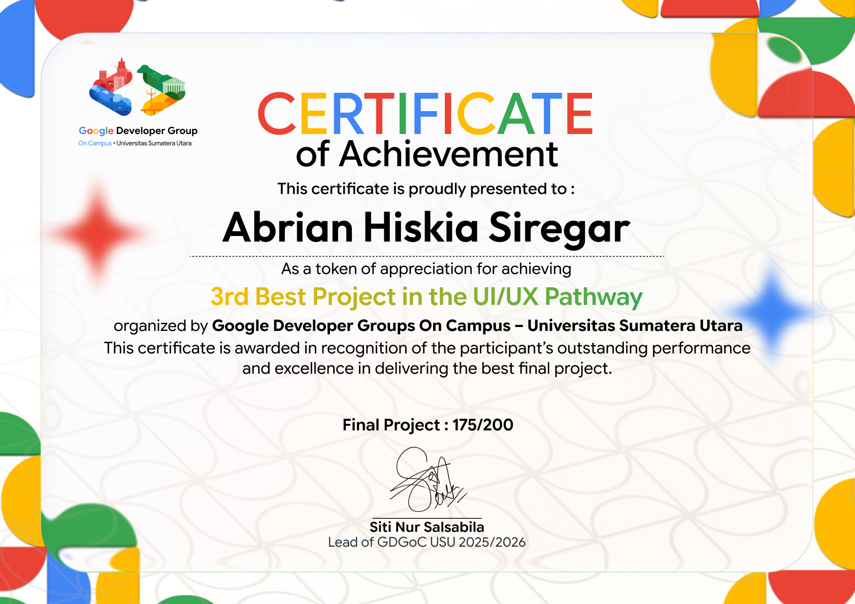 Proud to achieve 3rd Place Best Project in the UI/UX Pathway organized by GDG On Campus USU. This journey enhanced my understanding of user-centered design and collaborative problem solving.