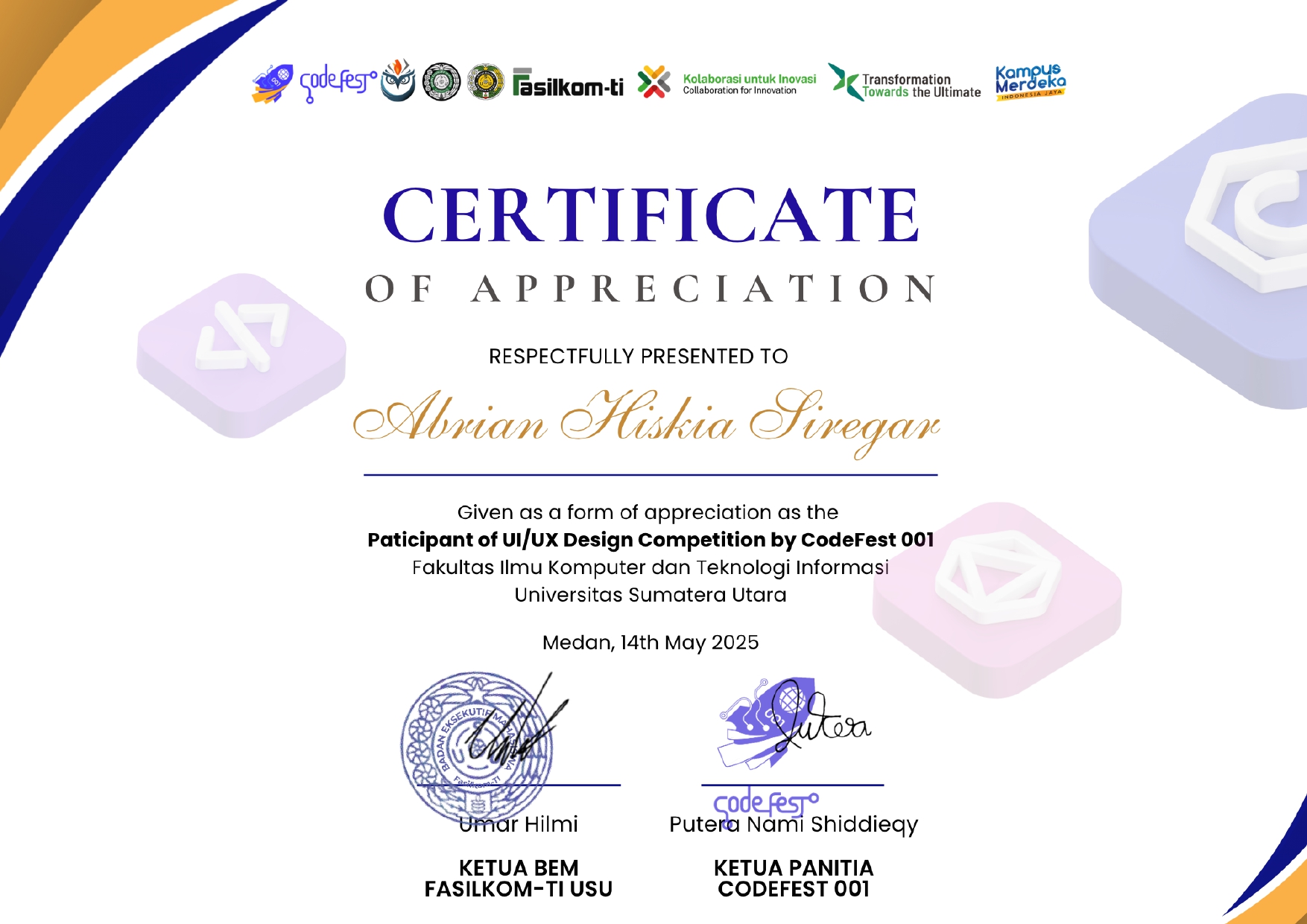 Honored to receive a Certificate of Appreciation as a participant in the UI/UX Design Competition at CodeFest 001, Universitas Sumatera Utara.