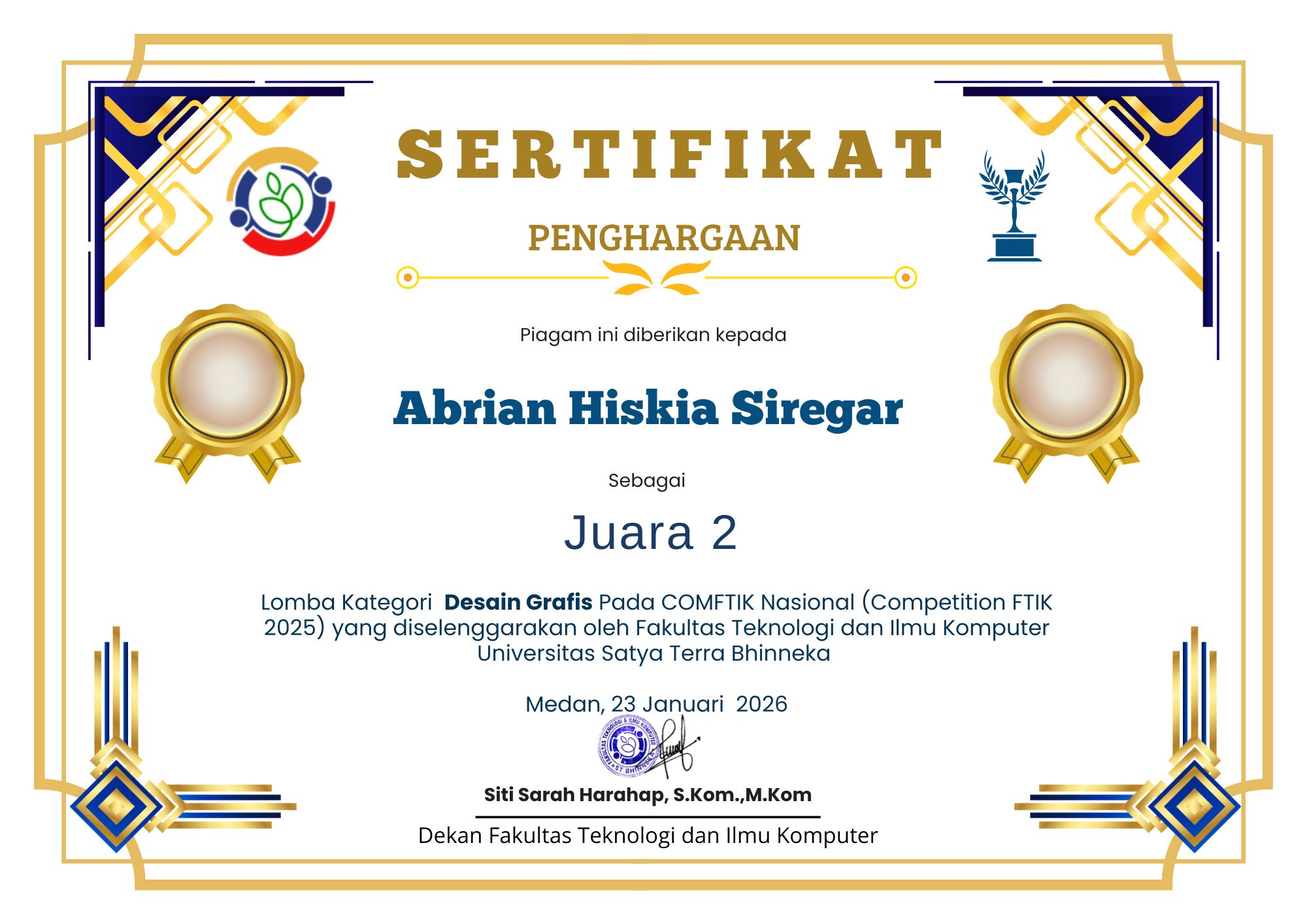 Grateful to achieve 2nd Place in the Graphic Design Competition at COMFTIK Nasional 2025. This achievement reflects my passion for visual communication, creativity, and impactful design.